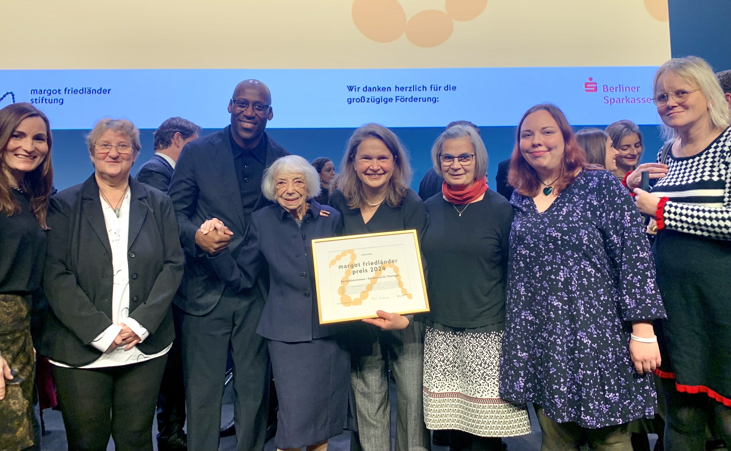 Berlin 28/11/2024 Das Projekt „Barrierefrei erinnern – das Zentrum für Thüringen” der Lebenshilfe Thüringen wurde am gestrigen Abend in Berlin mit dem Preis der Margot-Friedländer-Stiftung ausgezeichnet. Der Margot Friedländer Preis würdigt Menschen, die sich in Initiativen oder Projekten für Toleranz und Menschlichkeit und gegen Antisemitismus und Demokratiefeindlichkeit einsetzen. In der Laudatio würdigte die Jury das Engagement des Projektes um die Aufklärung über die Verbrechen des Nationalsozialismus in einfacher und leichter Sprache.
