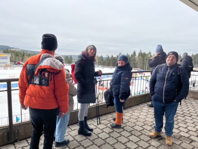 Der wichtigste Austragungsort war Oberhof. Da waren wir natürlich neugierig und wollen uns das mal anschauen. Am 31.1. fuhren 35 sportbegeisterte Menschen aus Egendorf, Apolda, Kromsdorf und Weimar zusammen in den Thüringer Wald. In Oberhof gab es dann auch einiges zu sehen. In der großen Sportarena konnten wir den Athleten beim Schneeschuhrennen, Skifahren und Snowboardfahren zujubeln. Dann gingen wir noch zu den Tänzer*innen. Dort staunten wir über die gekonnten Bewegungen und die tollen Kostüme der Sportler*innen.