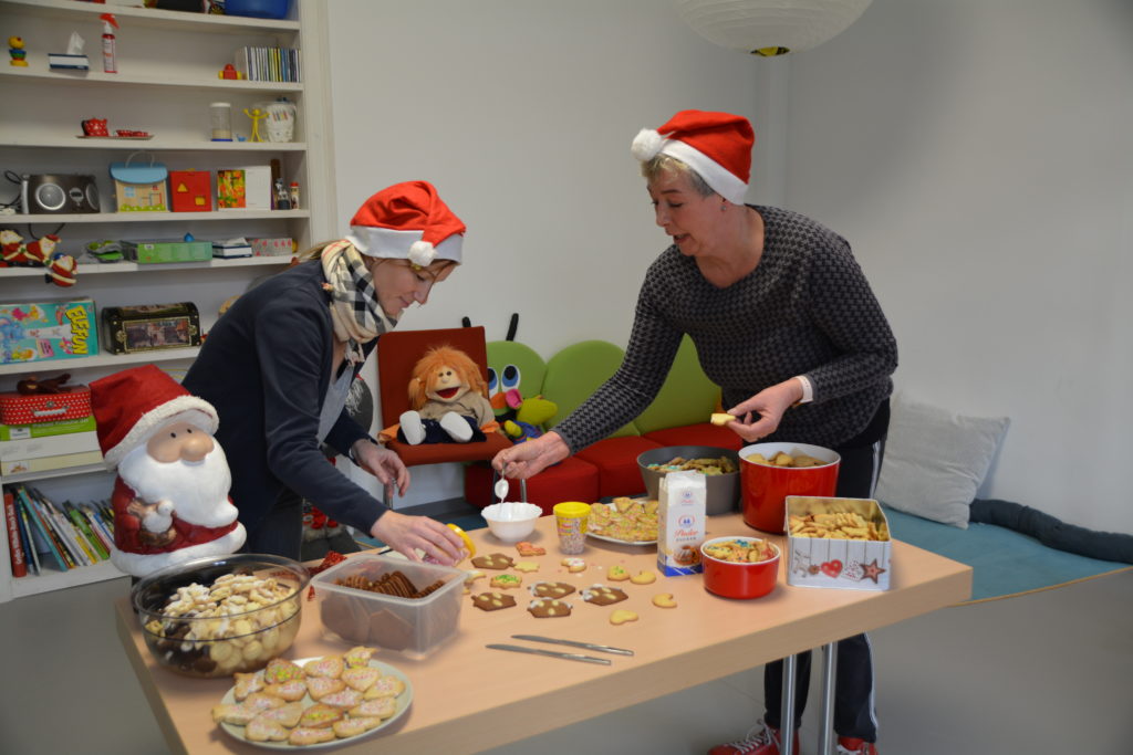 Eine Vorweihnachtszeit ohne gemeinsamen Adventsnachmittag mit den Kindern und ihren Familien? Für die Pädagoginnen und Therapeutinnen der Interdisziplinären Frühförderstelle Weimar unvorstellbar. Und doch muss durch Corona das gemütliche Beisammensein in diesem Jahr ausfallen. Deshalb verzauberten die Mitarbeiterinnen der Frühförderung die Räume in der Belvederer Allee 17 kurzerhand in Back- und Bastelstuben. Viele fleißige Hände siebten Mehl, kneteten Teig und es entstanden in Heimarbeit Sterne, Häuser, Lebkuchenmänner und Herzen aus leckerem Plätzchenteig. Nun werden in allen Räumen der Frühförderung Basteleien vorbereitet, Schablonen erstellt, Rezepte für die Weihnachtsbäckerei und Liedtexte für Weihnachtslieder aufgeschrieben. Im langen Flur werden all diese bunten Überraschungen dann liebevoll verpackt und anschließend zu den Kindern auf die Reise geschickt.