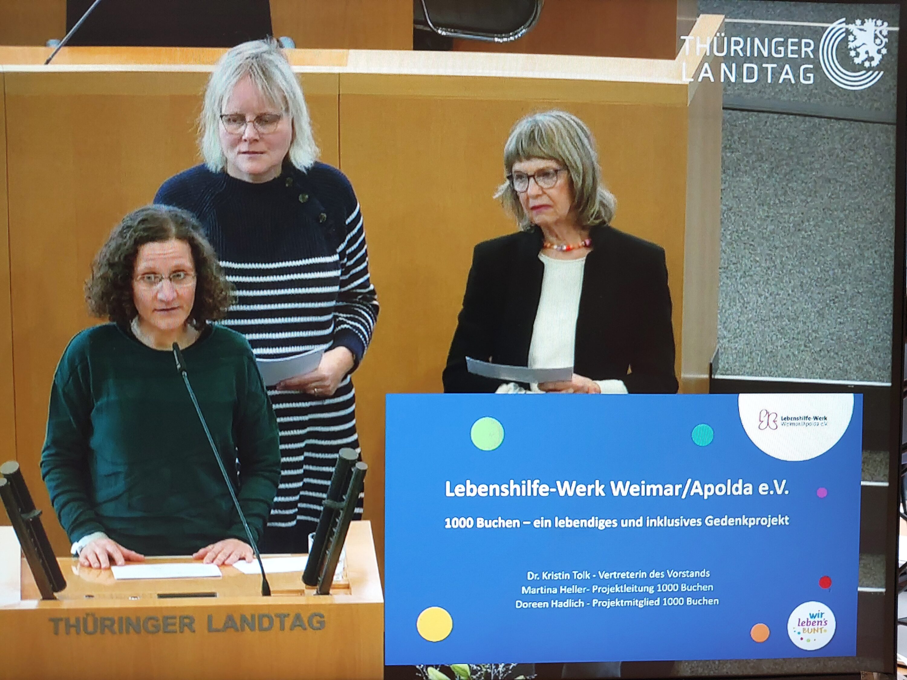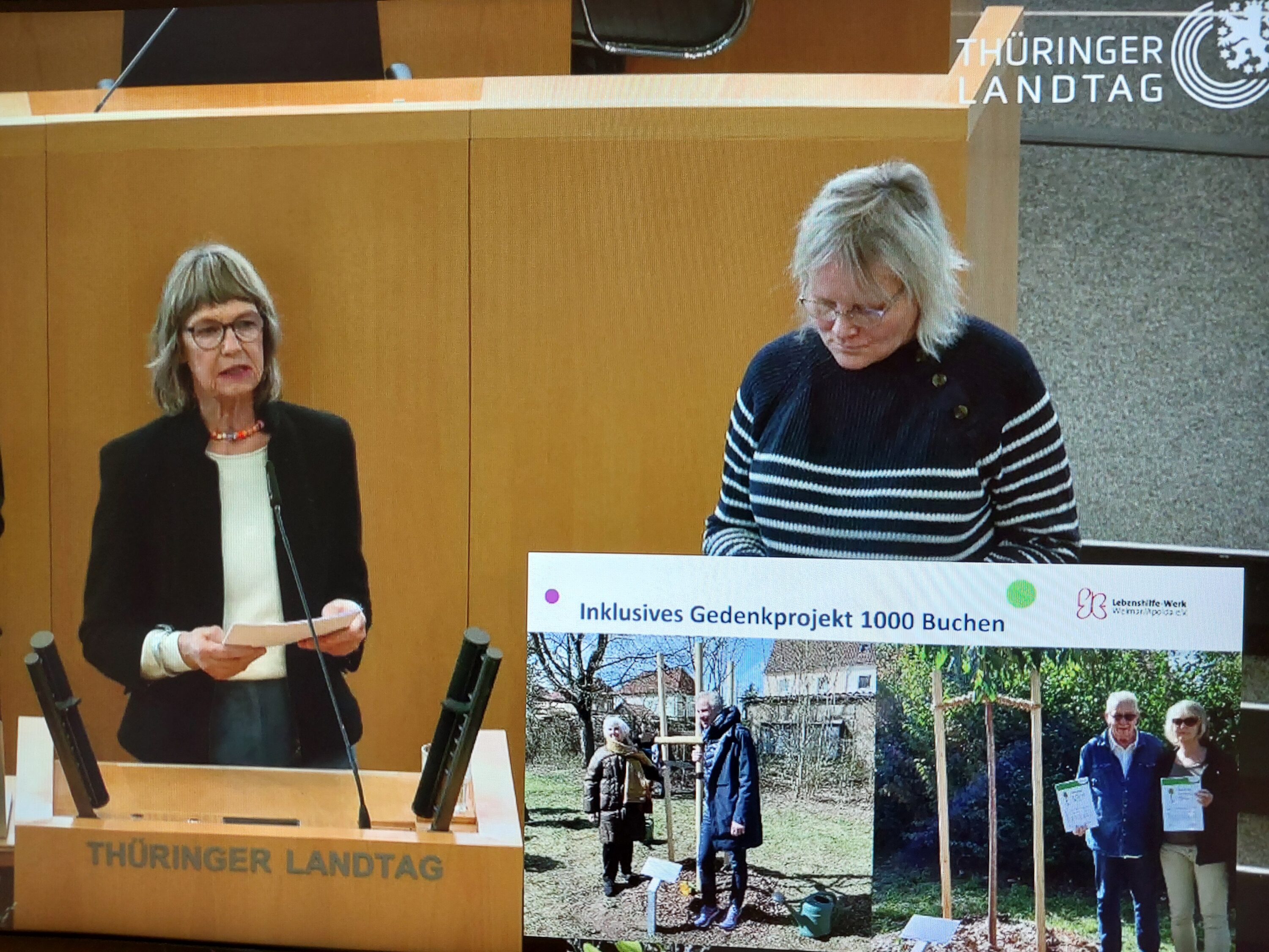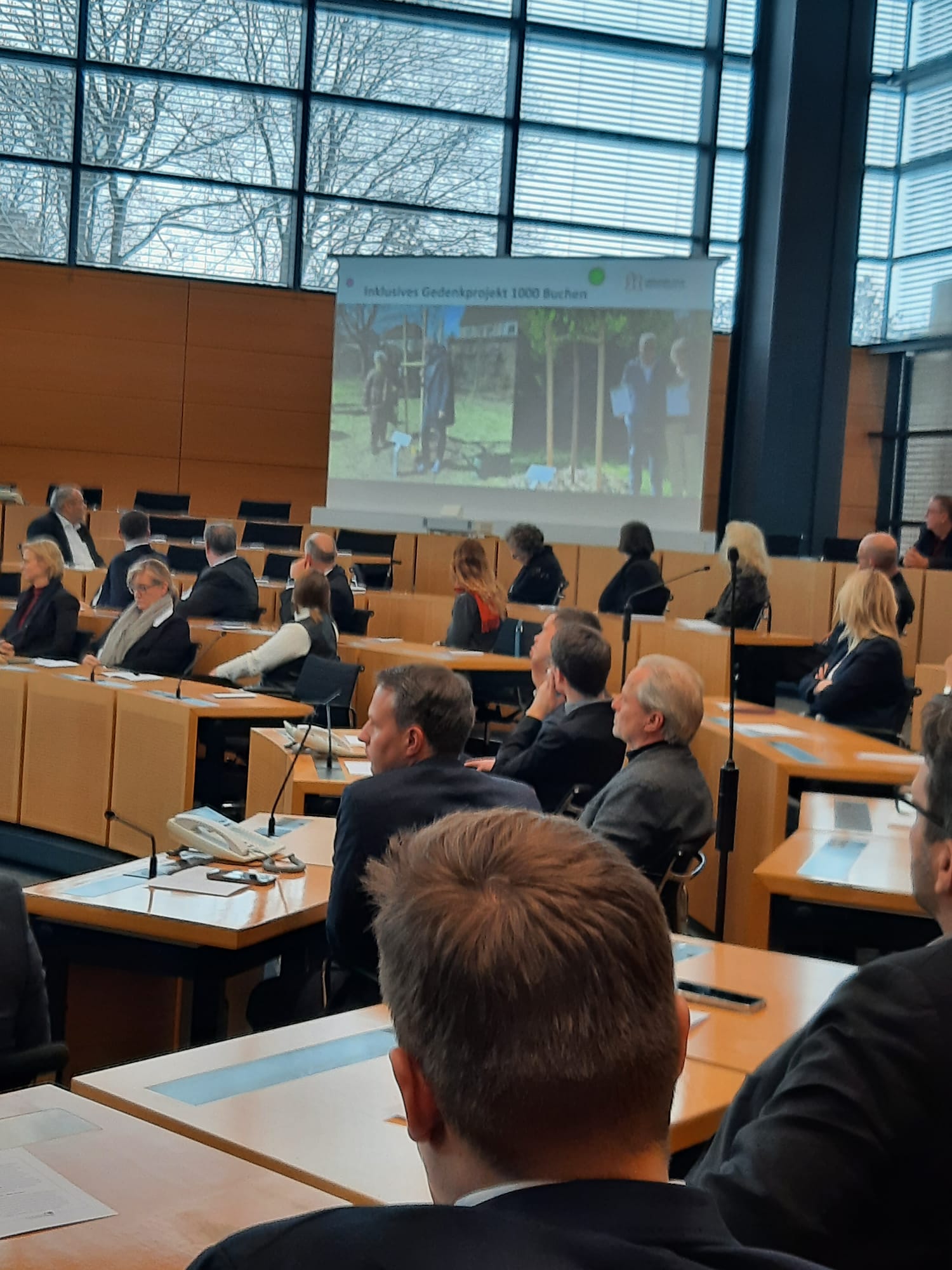 Wir, Dr. Kristin Tolk, Martina Heller und ich, sprachen im Plenarsaal über unser Herzensprojekt: das inklusive Gedenkprojekt 1000 Buchen. Es ging aber nicht nur um unsere Baumpflanzungen, sondern auch um die Verbrechen der Nazis in der Zeit von 1933 bis 1945. Nicht nur Jüdinnen und Juden, sondern auch Menschen mit Beeinträchtigungen galten als wertlos. Darüber haben wir gesprochen. Dieser Moment war sehr emotional und bewegend, denn es waren auch hochrangige Politiker und Politikerinnen anwesend.