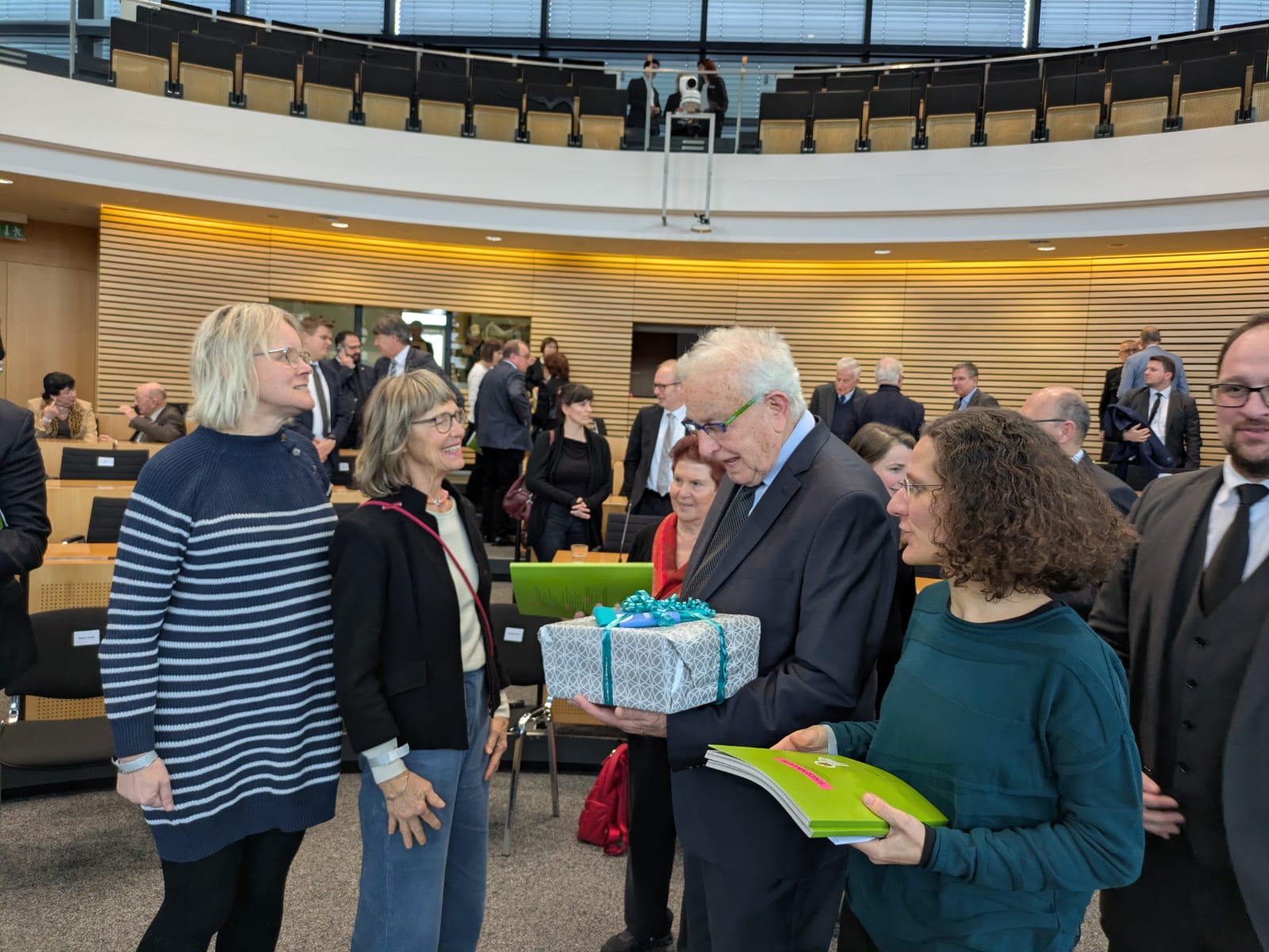 Am Ende der Veranstaltung haben wir an den Ministerpräsidenten, den Landtagspräsidenten und an Naftali Fürst kleine Geschenke vom Projekt 1000 Buchen überreicht. Sie haben sich sehr gefreut. Und wir haben unglaublich viel Lob für unsere Rede bekommen. Wir haben auch jeweils ein von Naftali Fürst persönlich signiertes Buch bekommen, was etwas ganz Besonderes ist.