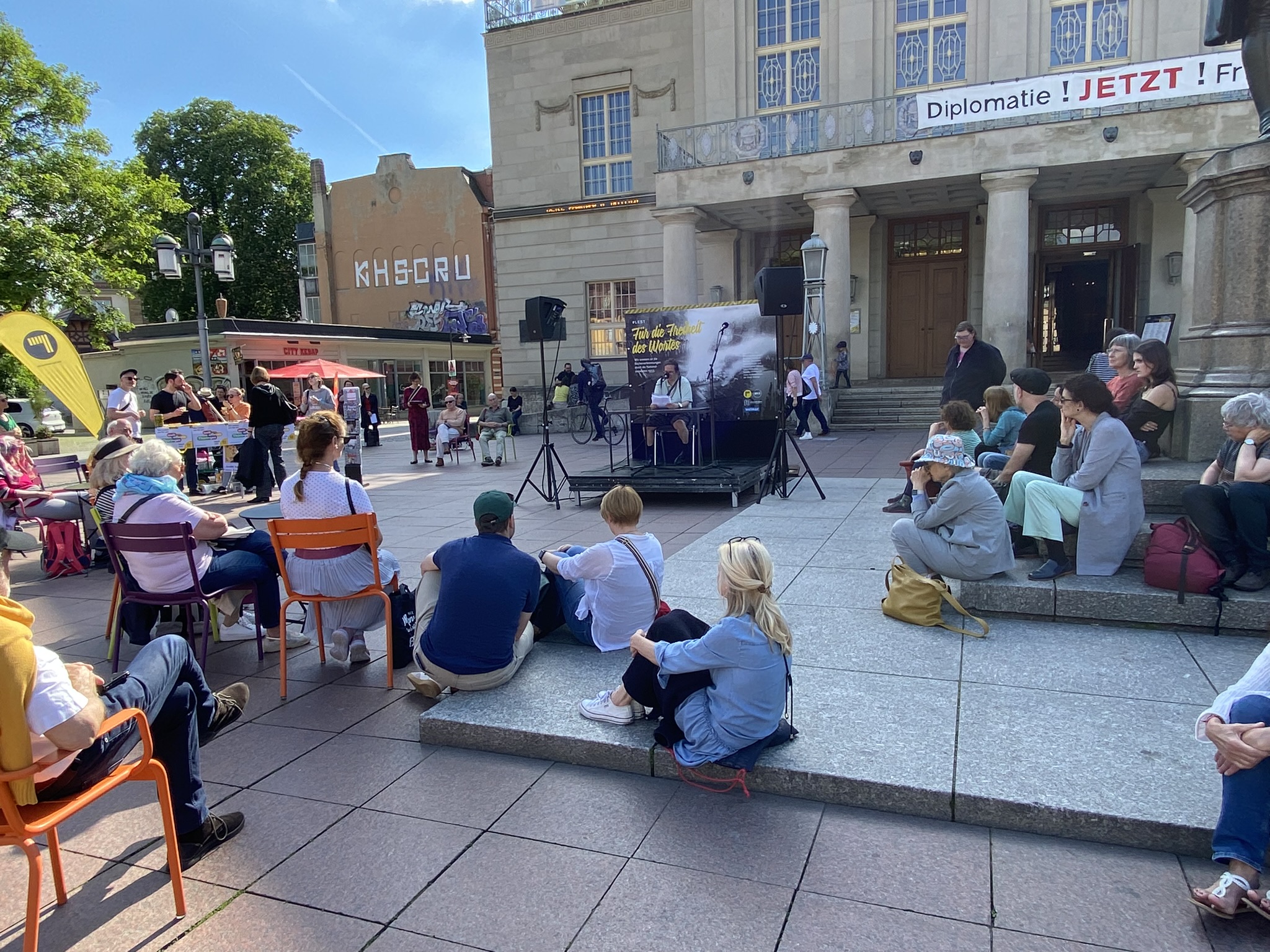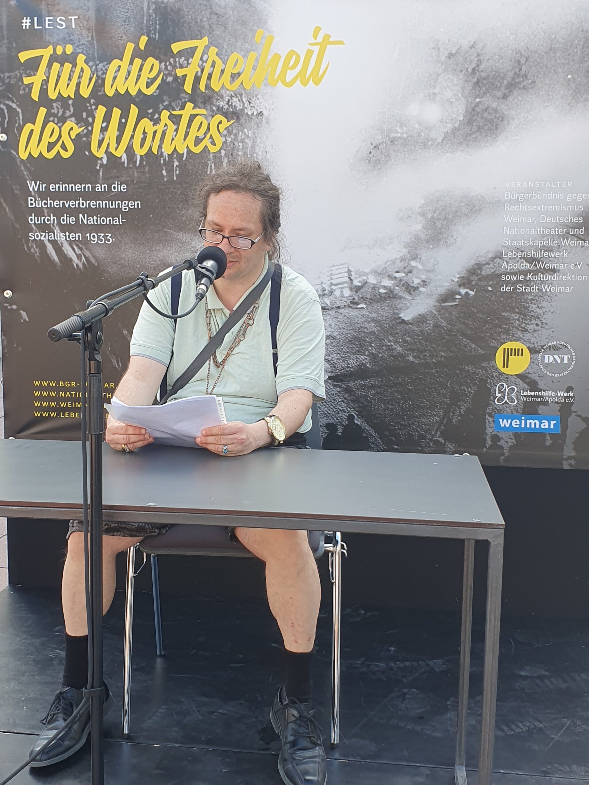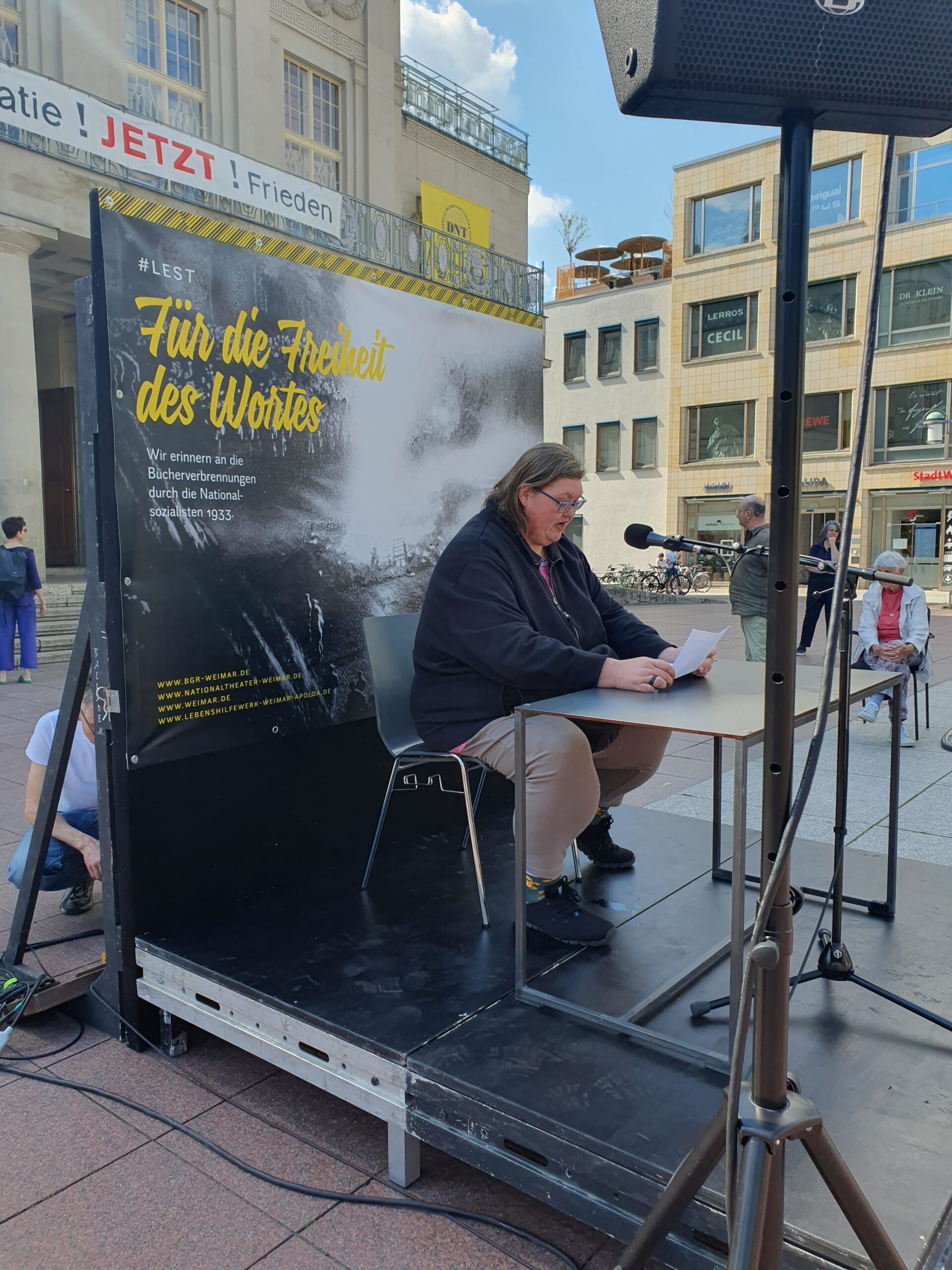 Am 10. Mai haben Weimarer Bürger*innen auf dem Theaterplatz Texte vorgelesen. Katharina Winter und Florian Ulrich als Selbstvertreter*innen unserer Werkstätten haben dabei mitgemacht. Sie haben ganz großartig kurze Texte vorgelesen, unter anderem von den Autoren Erich Fried und Kurt Tucholsky! Viele Menschen haben ihnen zugehört. Warum? Am 10. Mai 1933 brannten deutschlandweit die Bücher von Autor*innen zumeist jüdischer Herkunft. Es war eine der ersten Aktionen eines unmenschlichen politischen Systems, das am 8. Mai 1945 besiegt wurde. Immer noch und immer wieder gibt es genügend Stimmen, die die Verbrechen des Nationalsozialismus verharmlosen oder ganz und gar aus dem Gedächtnis streichen wollen.